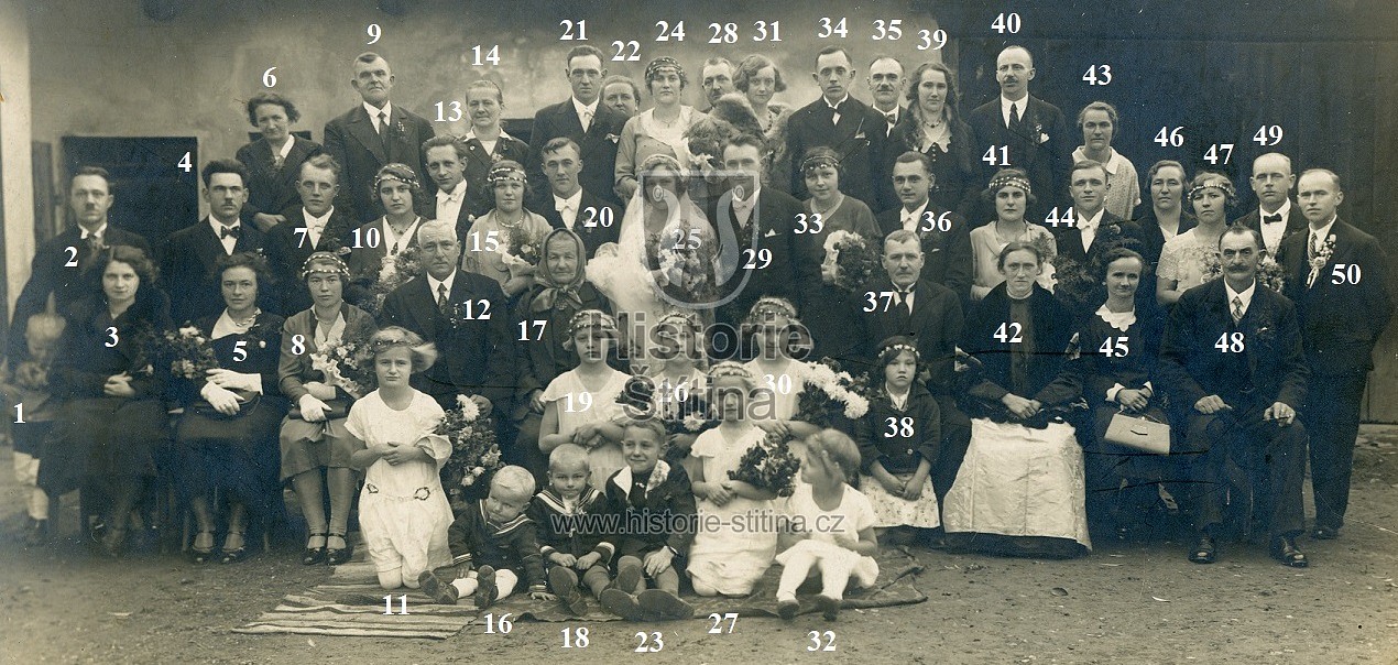 9 - Hubert Pavlík, 11 - Jiřina Skybová prov. Lexová, 12 - Josef Huška (otec nevěsty), 14 - Ludmila Pavlíková roz. Mikesková, 15 - Anna Hušková roz. Richtrová, 17 - Marie Hušková roz. Mikesková (matka nevěsty), 19 - Ludmila Střilková, 20 - Josef Huška ml., 25 - Ludmila Halšková roz. Hušková (nevěsta), 26 - Zdeňka Střilková, 29 - František Halška, 30 - Marie Střilková, 31 - Zikmunda Lacková roz. Müllerová, 34 - Vojtěch Lacek, 35 - Alois Skyba, 37 - Vincenc Halška (otec ženicha), 38 - Adolfa Střilková, 39 - Anděla Šustková roz. Hušková, 40 - Matouš Šustek, 41 - Johanna Dominiková roz. Bártková, 42 - Terezie Halšková roz. Onderková (matka ženicha),